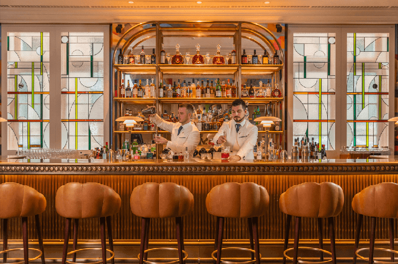 L’intérieur du Bar Magritte, conçu par Olga Polizzi en collaboration avec Sarah Daniels de DO Design Studio, est un véritable festin visuel. Les tons profonds et joyaux, les textures ludiques et les fenêtres en verre teinté inspirées de l’Art Déco créent une atmosphère captivante. Un papier peint mural personnalisé, inspiré par l’œuvre “Femmes” (1922) de Magritte, ajoute une touche surréaliste. Un long bar en laiton se trouve au centre, créant un point focal impressionnant.